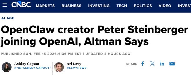 来源:环球网 【环球网科技综合报道】2月16日消息,据CNBC报道称,OpenAI 首席执行官 Sam Altman 日前通过社 交平台宣布,广受关注的开源 AI 代理工具 OpenClaw 的创始人、奥地利软件开发者 Peter Steinberger 将 正式加入 OpenAI。与此同时,OpenClaw 将作为一项开源项目,托管于 OpenAI 内部设立的基金会中, 并继续获得公司的技术支持。 OpenClaw 原名 Clawdbot 和 Moltbot,由 Steinberger 于2026年1月推出后迅速走红。该工具能够自主执行 任务——包括管理电子邮件、调用在线服务、代表用户做出决策等。 Altman 在声明中高度评价 Steinberger 的技术远见:"他是一位天才,对未来智能体如何相互协作、为人 们完成大量有用任务有着许多令人惊叹的想法。我们预计这将很快成为我们产品供应的核心。" 外媒称,尽管此次合作的具体财务条款未予披露,但此举延续了 OpenAI 近年来大举招揽顶尖 AI 人才 和团队的战略。2025年5月,OpenAI 以逾60亿美元收购了由前苹果首席设计师 Jony Ive 联合创办 ...
