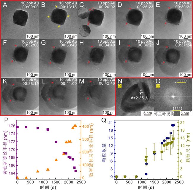 图中A-M表示不同反应时间下黄铁矿在10ppb金溶液中的反应动态过程。科研团队供图 黄铁矿诱导金沉淀是形成高品位金矿的关键环节。由中国科学院广州地球化学研究所研究员朱建喜和鲜 海洋牵头的科研团队,通过原位液相透射电子显微镜等多尺度、多手段联用技术,实时观测了黄铁矿与 浓度为10ppb(即十亿分之十)的极低浓度含金溶液的反应过程。 来源:科技日报 "我们发现,当两者接触约13分钟后,黄铁矿周围形成了'致密液体层'。约20分钟后,该层内开始出现 黄金纳米颗粒,并随时间推移逐渐增多、长大。这一发现为揭示金在黄铁矿表面的形成过程提供了关键 依据。"朱建喜说。 ◎ 科技日报记者 叶青 通讯员 孔令竹 经进一步研究,他们发现黄金纳米颗粒并非在溶液中凭空产生,而是在紧贴黄铁矿表面的"致密液体 层"中诞生。即使外部溶液中金浓度极低,该机制仍能持续驱动金向界面迁移并实现富集沉淀。该机制 中国科学家利用原位液相透射电子显微镜技术,首次从纳米尺度原位"直播"了液相环境中的黄金纳米颗 粒在黄铁矿表面形成的动态过程,提出黄铁矿诱导金沉淀的新机制。该成果将于本周在《美国国家科学 院院刊》正式上线。 同时适用于热液型金矿床和表生金富集过程 ...