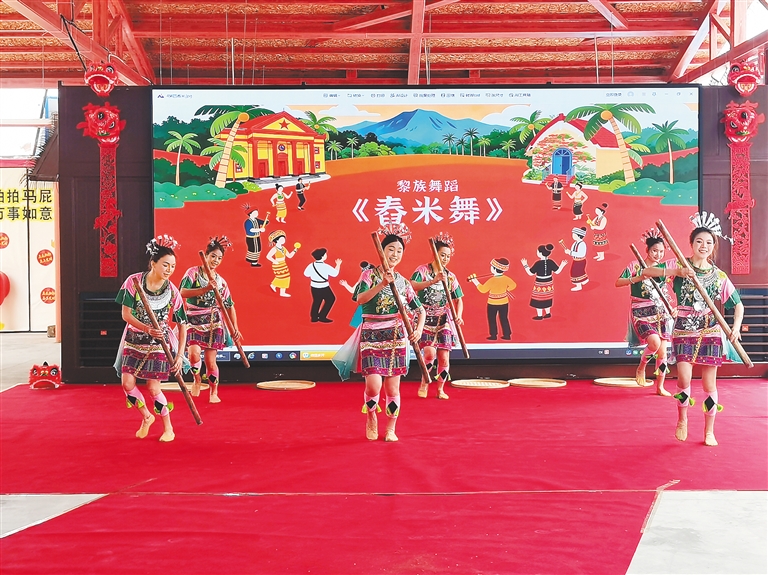 开场舞蹈《春海》拉开序幕,黎族传统服饰秀《通什春声》、毛道乡藤编与植物染时尚秀《编·藤绕春 声》《染·五色纳福》将非遗技艺与现代审美巧妙结合;黎族舞蹈《舂米舞》、鼻箫独奏《新春祝福到黎家》 则原汁原味呈现了黎乡的民俗风情与文化底蕴,让观众近距离感受非遗的鲜活生命力。 互动体验区10项免费互动活动吸引了众多市民游客参与。游客可以亲手体验植物染手帕、藤编小船或灯 笼、黎锦包包手作,在跳竹竿舞、手打糍粑中感受民俗乐趣,还能通过古法炒茶、敲钟祈福、挂心愿牌、猜 灯谜等活动,沉浸式解锁黎乡新春习俗。 本次非遗游园会不仅集中展示了通什镇的黎锦技艺、山兰酒香,以及毛道乡春米舞背后的农耕文化,还 推出了植物染坊、藤编厂的新春新品,实现了"山"的丰盛与"城"的荟萃的完美融合。活动通过"沉浸式体验 互 动式传播"的方式,让非遗走出展馆、走进大众,既丰富了市民游客的新春文化生活,也为五指山非遗文化的 传承与发展注入了新活力。(记者 黄富国 通讯员 刘婳婳) 黎族舞蹈《舂米舞》表演现场。记者 黄富国 通讯员 刘婳婳 摄 2月23日上午,五指山市通什镇、毛道乡联合举办非遗游园会,在通什镇龙庆新村,这场融合了非遗展 示、民俗体验与文化对 ...
