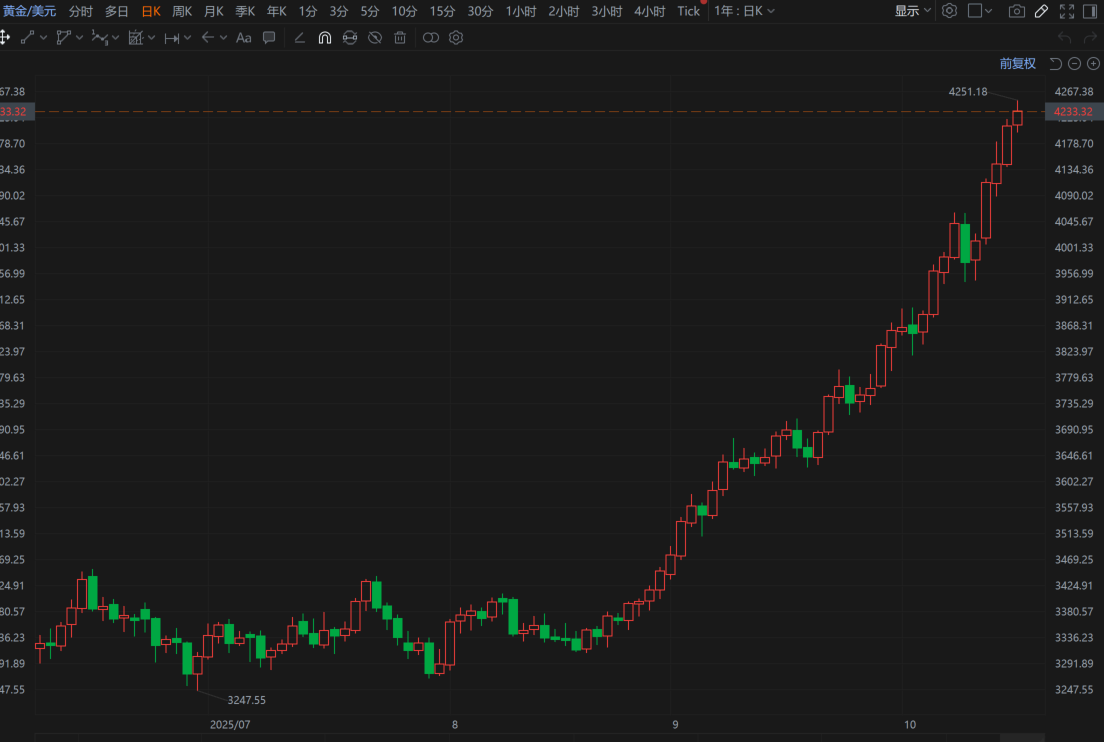 Core Insights - Spot gold reached $4250, marking a 1.01% increase and setting a new historical high on October 16 [1] Group 1 - The price of spot gold has shown a significant upward movement, indicating strong market demand [1] - The increase in gold prices reflects ongoing economic uncertainties and investor behavior favoring safe-haven assets [1]