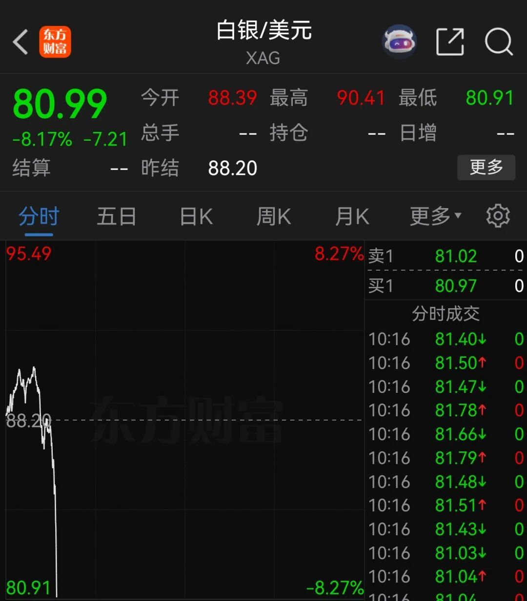 今日早盘,现货白银快速跳水,一度跌超8%,现货黄金亦跌超1%。 | | | | 白银/美元 | | IZ | | | | --- | --- | --- | --- | --- | --- | --- | --- | | | | | XAG | | | | | | 80.99 | | 今井 | 88.39 最高 | 90.41 | 最低 | 80.91 | | | -8.17% -7.21 | | 总手 | 持仓 | | 日曾 | | | | 结算 | | 昨结 | 88.20 | | | 电子 | | | 关时 | 五日 | 日K | 周K | 目K | 亜多▼ | | | | 95.49 | | | | 8.27% 卖1 | 81.02 | | 0 | | | | | | 买1 | 80.97 | | O | | | | | | | 分时成交 | | | | | | | | 10:16 | | 81.404 | 0 | | | | | | 10:16 | | 81.501 | | | | | | | 10:16 | | 81.474 | | | | | | | 10:16 | | 81.781 | | | ...