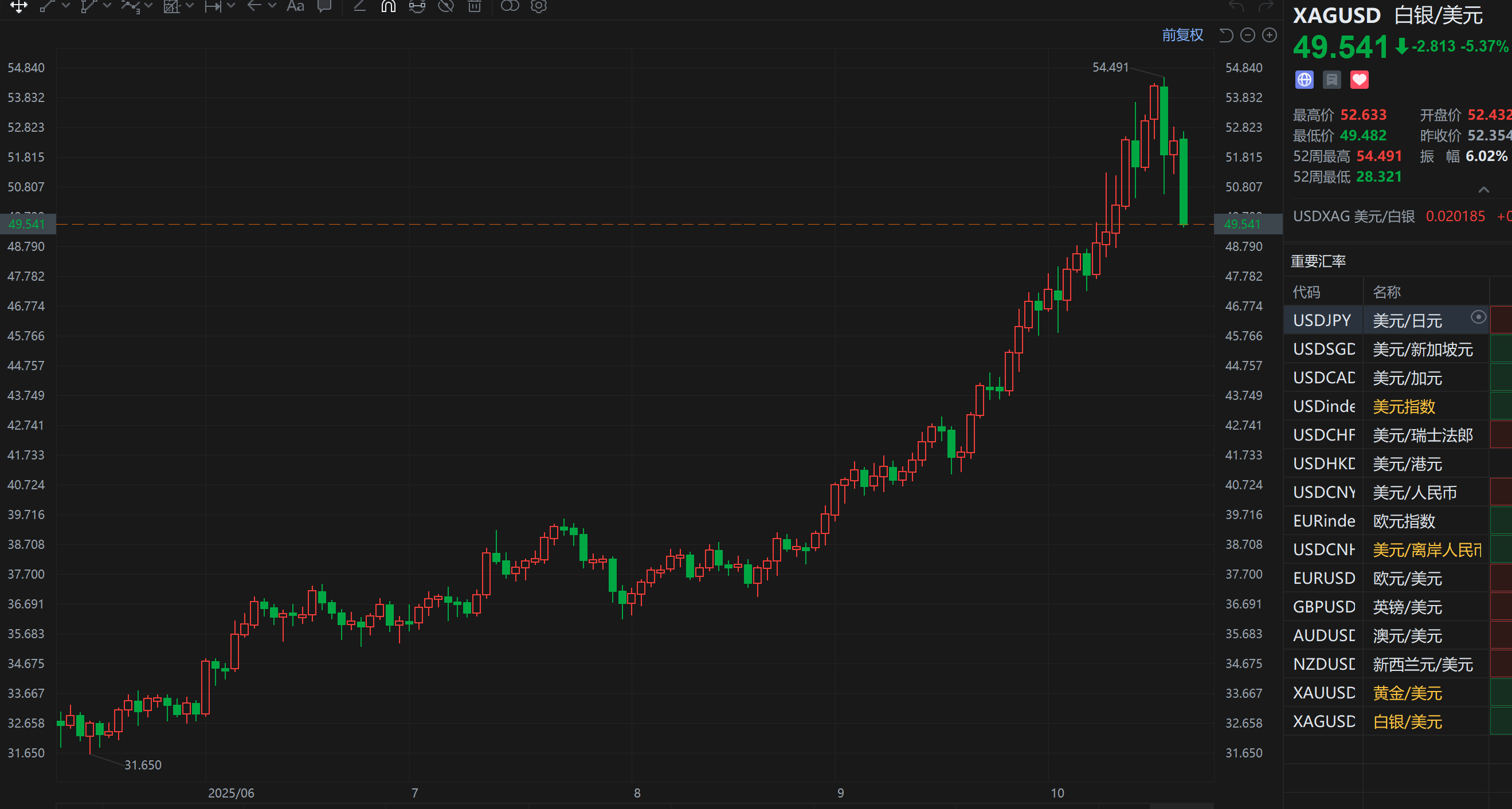 10月21日,现货白银日内跌幅扩大至7%,现报48.63美元/盎司。现货黄金日内跌幅扩大至5%,报 4135.46美元/盎司。 ...