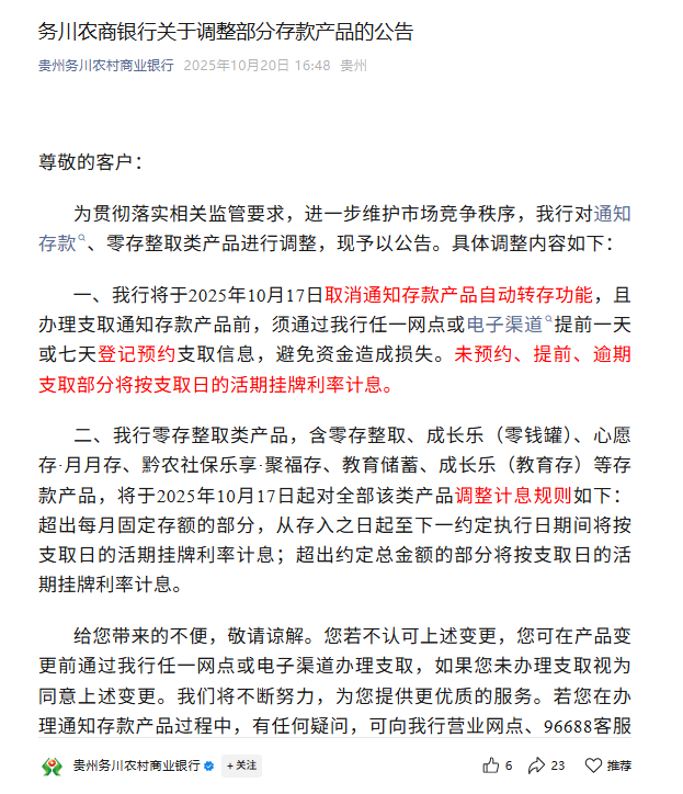 Core Viewpoint - Recent adjustments by several small and medium-sized banks in Guizhou Province, including the cancellation of automatic renewal for notice deposits, reflect a response to regulatory requirements aimed at maintaining market order and reducing high-interest deposit products [1][2][5]. Group 1: Regulatory Changes - Guizhou Wuchuan Rural Commercial Bank announced the cancellation of the automatic renewal feature for notice deposits effective October 17, in line with regulatory directives [1][2]. - Over ten banks in Guizhou, including rural credit cooperatives and village banks, have issued similar announcements regarding the adjustment of notice deposit products [5]. - Beijing Bank has also adjusted its notice deposit rates, linking new unit notice deposits to its listed interest rates starting October 1, 2025 [5]. Group 2: Market Impact - The adjustments by local banks are seen as a move to lower notice deposit interest rates and align them more closely with demand deposit rates [5][6]. - Major state-owned banks and most joint-stock banks had already halted automatic renewal of notice deposits in the second half of last year, indicating a broader industry trend [6]. - The disappearance of high-interest deposits and the continuous decline in fixed deposit rates may encourage customers to shift their funds towards bank wealth management products and gold investments [7]. Group 3: Industry Dynamics - The pressure on banks' interest margins has increased, prompting them to reduce high-interest deposit products while seeking alternative methods to attract deposits [6]. - The competitive landscape among banks remains intense, with the potential for some high-interest products to re-emerge in the future [6].