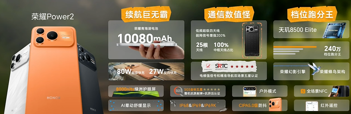 Core Viewpoint - The launch of Honor Power 2 marks a significant advancement in smartphone technology, featuring the Dimensity 8500 Elite chip and a large 10080mAh battery, with a starting price of 2699 yuan [1]. Group 1: Product Features - Honor Power 2 is equipped with a matte metal frame and utilizes an integrated cold carving process design, available in colors such as Sunrise Orange, Snow White, and Phantom Black [1]. - The device boasts IP68, IP69, and IP69K ratings for dust and water resistance, ensuring durability in extreme conditions [1]. - The thickness of the new device is 7.98mm, and it supports 27W reverse charging functionality [2]. Group 2: Performance and Technology - The smartphone features a self-developed RF enhancement chip C1+ and a parallel dual-track antenna design, claiming a 200% enhancement in weak network signal [2]. - It includes a 6.79-inch 8000nits ultra-bright Honor Oasis eye protection display, enhancing user experience in various lighting conditions [2]. Group 3: Pricing and Variants - The pricing for the Honor Power 2 is set at 2699 yuan for the 12GB RAM and 256GB storage version, while the 12GB RAM and 512GB storage version is priced at 2999 yuan [2].