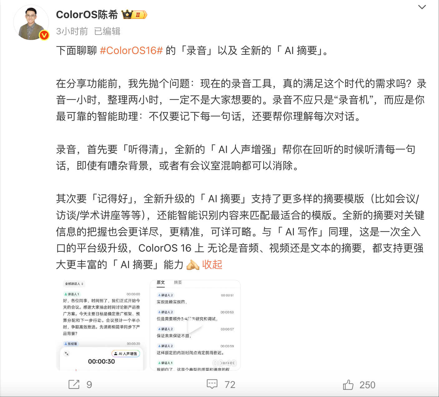 OPPO ColorOS 16录音支持“AI人声增强” 可消除嘈杂背景、会议室混响等噪音