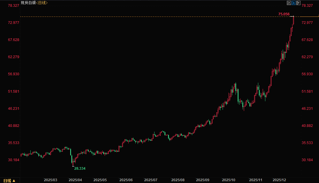 Core Viewpoint - The prices of gold and silver have reached historical highs, driven by multiple factors including monetary policy changes and geopolitical risks [1][3]. Gold Market Summary - On December 26, spot gold prices peaked at $4,531.284 per ounce before settling at $4,502.44, reflecting a 0.51% increase [1]. - The recent surge in gold prices is attributed to three main factors: the Federal Reserve's resumption of a loose monetary policy, a decline in the credibility of the US dollar, and escalating global geopolitical risks [3]. - Despite the current high prices, there are concerns about potential market bubbles as gold prices exceed short-term valuation models [3]. - The bullish trend in gold is expected to continue as the Federal Reserve's policies and the US economy have not yet shown signs of a turning point [3]. Silver Market Summary - Spot silver prices reached a high of $75.142 per ounce, currently trading at $74.584, marking a 3.86% increase [1][2]. - The silver market is characterized by its smaller scale and sensitivity to industrial demand, making it more reactive to investment and speculative activities [4]. - A significant indicator of physical silver shortages is the one-year silver swap rate, which has dropped to -7.18%, indicating a premium for immediate physical delivery over future contracts [4]. - This inversion suggests that investors are prioritizing physical silver over paper contracts, leading to a potential "run" on the physical silver market [4][5]. - As long as the shortage persists, the upward trend in silver prices is likely to continue [5].