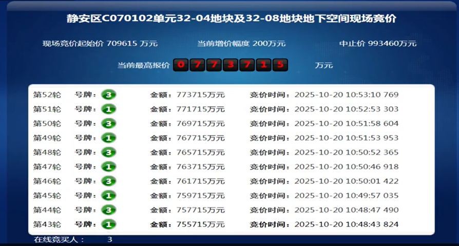 52轮竞价,静安区苏河湾板块宅地77.37亿元成交,单价超8.1万元/平方米