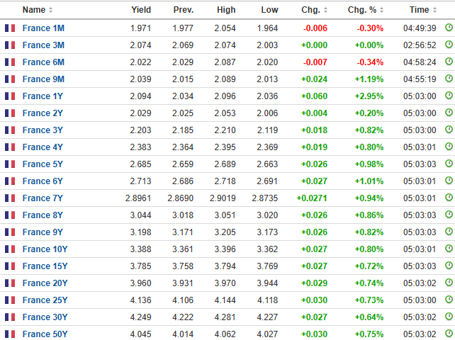 | Name # | | Yield | Prev. | High | Low | Chg. = | Chg. % = | Time = | | | --- | --- | --- | --- | --- | --- | --- | --- | --- | --- | | France 1M | | 1.971 | 1.977 | 2.054 | 1.964 | -0.006 | -0.30% | 04:49:39 | © | | | France 3M | 2.074 | 2.069 | 2.074 | 2.003 | +0.000 | +0.00% | 02:56:52 | 0 | | | France 6M | 2.022 | 2.029 | 2.087 | 2.020 | -0.007 | -0.34% | 04:58:24 | 0 | | | France 9M | 2.039 | 2.015 | 2.089 | 2.013 | +0.024 | +1.19% | 04:55:19 | 0 | | France 1Y | | 2.094 | 2.034 | 2.096 | 2.036 | +0.06 ...