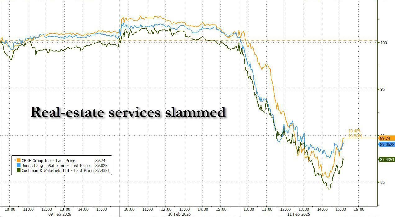 Core Viewpoint - The recent sell-off in the U.S. stock market, particularly affecting real estate service stocks, is driven by investor fears regarding the disruptive potential of AI applications in various industries [1][3]. Group 1: Market Impact - Several real estate service stocks, including CBRE Group and JLL, experienced significant declines, with CBRE dropping 12% and JLL falling 14%, marking their largest single-day drops since the COVID-19 pandemic [3]. - The commercial real estate sector is facing renewed challenges, exacerbated by the pandemic's impact on office demand and high interest rates affecting transaction volumes [3]. - Investors are increasingly withdrawing from high-fee, labor-intensive business models perceived as vulnerable to AI disruption, as noted by analysts [3][4]. Group 2: Broader Industry Concerns - The sell-off has extended beyond real estate, affecting SaaS, insurance brokerage, and wealth management stocks, indicating a widespread concern about AI's potential to disrupt various sectors [4][5]. - Companies like CBRE and JLL are attempting to mitigate downward pressure by diversifying into property management and valuation across various sectors, including hotels and life sciences [4]. - Analysts express that the recent stock price declines may be overreactions, as the risks associated with AI disruption have been present for some time and are not new [4][5]. Group 3: AI Disruption Debate - The introduction of AI tools, such as those by Anthropic, has intensified fears of industry-wide disruption, leading to a "sell first, ask questions later" mentality among investors [4][6]. - Concerns about AI's impact on employment and commercial real estate demand are prevalent, but some analysts argue that the actual threat to leasing and capital markets is limited [4][6]. - The market's reaction reflects a broader anxiety about potential reversals in stock valuations, driven by recent AI spending and a resilient U.S. economy [6][7].