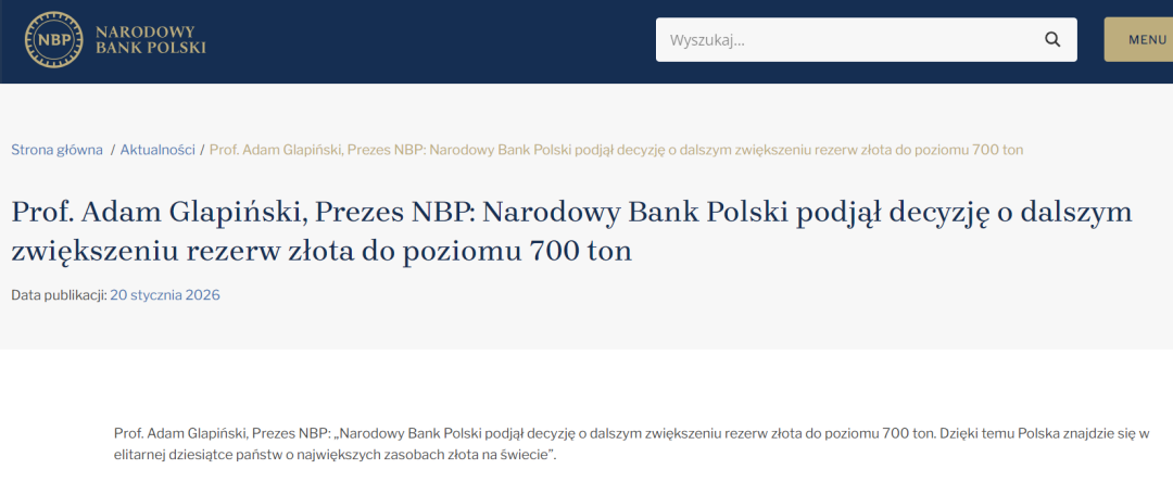 Glapinsk认为,黄金是一种零信用风险的资产,不受其他国家货币政策决定的影响,并且对金融冲击具有较强的抵御能力,高额黄金储备也有助于提升波 兰经济的稳定性。 波兰央行(NBP)当地时间周二表示,已批准一项购买多达150吨黄金的计划,此举将使该国的黄金储备总量增加到700吨。 波兰央行在一份声明中称:"这将使波兰跻身全球黄金储备量最大的前10个国家之列。"波兰央行行长Adam Glapinsk上周宣布,他希望央行管理委员会将 黄金持有量上限从截至12月31日的550吨提高到700吨。 波兰黄金储备超越欧洲央行的消息,其意义远不止于象征层面。欧洲央行的黄金储备约为506.5吨,相较之下,波兰央行持有的550吨规模令人瞩目,也进 一步强化了波兰在欧洲金融体系中的地位。 波兰央行的购金行动正值黄金价格不断刷新历史纪录之际。尽管2026年价格上涨速度可能放缓,但主要金融机构的预测仍偏乐观。ING预计平均价格约为 每盎司4150美元,德意志银行给出4450美元,高盛将预测上调至4900美元。在全球需求强劲的情景下,摩根大通甚至预计价格可能达到每盎司5300美元。 Bassani-Prusik强调:"央行需求上升是对经 ...