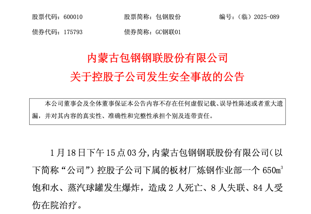 1月19日早间,包钢股份(600010)发布关于控股子公司发生安全事故的公告。 | 股票代码:600010 | 股票简称:包钢股份 | 编号:(临)2025-089 | | --- | --- | --- | | 债券代码:175793 | 债券简称:GC钢联01 | | 公告显示,1月18日15点03分,包钢股份控股子公司下属的板材厂炼钢作业部一个650m饱和水、蒸汽球罐发生爆炸,造成2人死亡、8人失联、84人受伤在 院治疗。 包钢股份称,事故发生后,公司立即启动应急预案,全力组织力量进行人员搜救、伤员救治、善后安抚等工作,全力配合相关部门对事故进行调查,认真 查明事故原因。本次事故造成板材厂部分厂房和设备受损,将对板材厂产线及周边受波及的产线生产造成影响,具体损失情况正在核实评估。经包头市生 态环境部门跟踪检测,未发现本次事故对周边大气、土壤环境造成影响,现场无废水产生。 同日早间,包头市召开新闻发布会,通报包钢股份板材厂爆炸事故相关情况。据发布会介绍,针对事故可能造成的影响,当地已组织力量对厂区及周边5 公里范围内安全隐患进行全面排查。事故厂区已停止生产。内蒙古自治区已成立事故调查组深入调查事故原因和责 ...