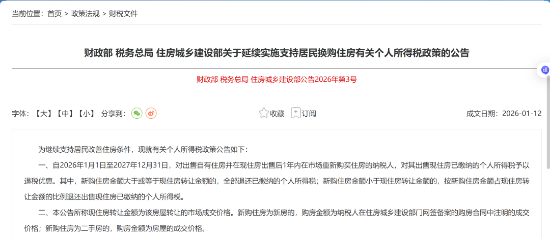 1月14日,财政部、税务总局、住房城乡建设部发布《关于延续实施支持居民换购住房有关个人所得税政策的公告》(以下简称"公告")表示,为继续支 持居民改善住房条件,延续实施支持居民换购住房有关个人所得税政策。 公告显示,自2026年1月1日至2027年12月31日,对出售自有住房并在现住房出售后1年内在市场重新购买住房的纳税人,对其出售现住房已缴纳的个人所 得税予以退税优惠。 其中,新购住房金额大于或等于现住房转让金额的,全部退还已缴纳的个人所得税。 新购住房金额小于现住房转让金额的,按新购住房金额占现住房转让金额的比例退还出售现住房已缴纳的个人所得税。 记者了解到,换房退个税政策于2022年9月30日落地,并在2023年8月延期至2025年12月31日,本次为第二次延期。此次三部门发文将退税政策延期至2027 年底,意在继续支持改善性住房需求,支持居民改善住房条件。 "该政策自推出以来续期了两次,反映出政策对市场持续的纾困力度。希望通过降低交易成本,从而涵养税源,促进市场交易活跃度提升,带动总税收的 稳定。同时,降税也有利于从交易成本来稳定市场情绪。"广东省城乡规划院住房政策研究中心首席研究员李宇嘉分析称。 中 ...
