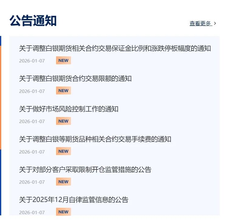 Core Viewpoint - The Shanghai Futures Exchange (SHFE) has implemented new risk control measures for silver futures trading in response to recent market volatility and rising speculative activities in precious metals [1][4]. Group 1: Trading Limits and Margin Adjustments - Starting from January 9, 2026, the maximum number of contracts for day trading in silver futures for non-futures company members and certain foreign participants will be limited to 7,000 contracts [1]. - The margin requirements and price fluctuation limits for silver futures contracts AG2601, AG2602, AG2603, and AG2604 will be adjusted, with the new fluctuation limit set at 16% and the margin for hedging transactions at 17% [2][3]. Group 2: Fee Adjustments - Effective January 9, 2026, the transaction fee for day trading in silver futures AG2604 will be adjusted to 0.025% of the transaction amount, while the fee for tin futures SN2602 will be set at 15 yuan per contract [3]. Group 3: Market Context and Previous Measures - This marks the fourth round of risk control measures implemented by SHFE for silver futures since December of the previous year, aimed at curbing excessive speculation and promoting rational investment [4]. - Since the end of last year, prices for gold and silver have experienced significant increases, followed by substantial fluctuations, with silver prices dropping over 5% as of January 7 [4].