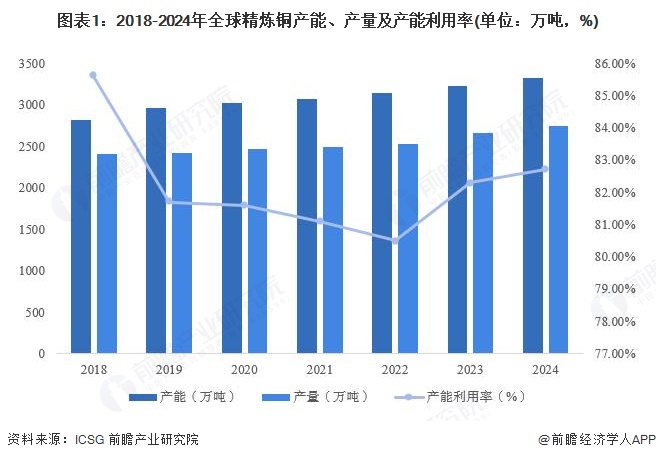 以下数据及分析来自于前瞻产业研究院铜冶炼研究小组发布的《全球及中国铜冶炼行业发展前景展望与 投资机遇分析报告》。 铜冶炼行业主要上市公司:江西铜业(600362.SH)、铜陵有色(000630.SZ)、云南铜业(000878.SZ)、中国 大冶有色金属(00661.HK)、紫金矿业(601899.SH)、西部矿业(601168.SH)、白银有色(601212.SH)、洛阳 钼业(603993.SH)、中金黄金(600489.SH)、鹏欣资源(600490.SH)等 本文核心数据:全球精炼铜产能及产量、全球精炼铜消费结构、全球精炼铜产量及消费量预测 全球精炼铜产能及产量均呈现逐年提高的趋势 转自:前瞻产业研究院 2018-2024年,全球精炼铜产能及产量均逐年提高,2024年全球精炼铜产能达3323.6万吨,产量达2748.6 万吨,产能利用率为82.70%。其中再生精炼铜产量为458.1万吨,同比提高2.0%,占全球精炼铜产量比 重约为16.58%。 注:2024年数据出自ICSG在2025年4月28日发布的《Copper Market Forecast 2025/2026》,2024年数据 为ICSG初步估 ...