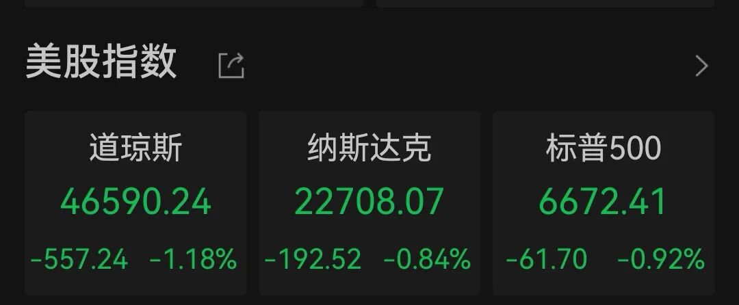 数据显示,当地时间11月17日,美股三大股指全线收跌,道指跌1.18%,标普500指数跌0.92%,纳指跌0.84%。美国科技七巨头指数跌0.47%,英伟达、苹 果跌近2%,谷歌涨超3%。中概股多数下跌。 美股三大股指全线收跌 当地时间11月17日,美股三大股指全线收跌。数据显示,截至收盘,道指跌1.18%报46590.24点,标普500指数跌0.92%报6672.41点,纳指跌0.84%报 22708.07点。 美股大型科技股多数下跌,美国科技七巨头指数下跌0.47%。个股方面,谷歌涨超3%,特斯拉涨逾1%,苹果、英伟达跌近2%,亚马逊、微软小幅下跌。 消息层面,此前巴菲特旗下伯克希尔·哈撒韦公司披露2025年第三季度持股报告(13F)显示,伯克希尔三季度新建仓1784万股谷歌母公司Alphabet的股 票,使之一跃成为其第十大持仓股票。 中概股多数下跌,纳斯达克中国金龙指数跌1.21%。个股方面,阿特斯太阳能跌超15%,小鹏汽车跌超10%,禾赛科技跌逾6%,晶科能源涨超13%,金山 云涨近9%,大全新能源涨超3%,阿里巴巴、华住集团涨超2%。 | S | 纳斯达克中国金龙指数(HXC) 11-17 16: ...