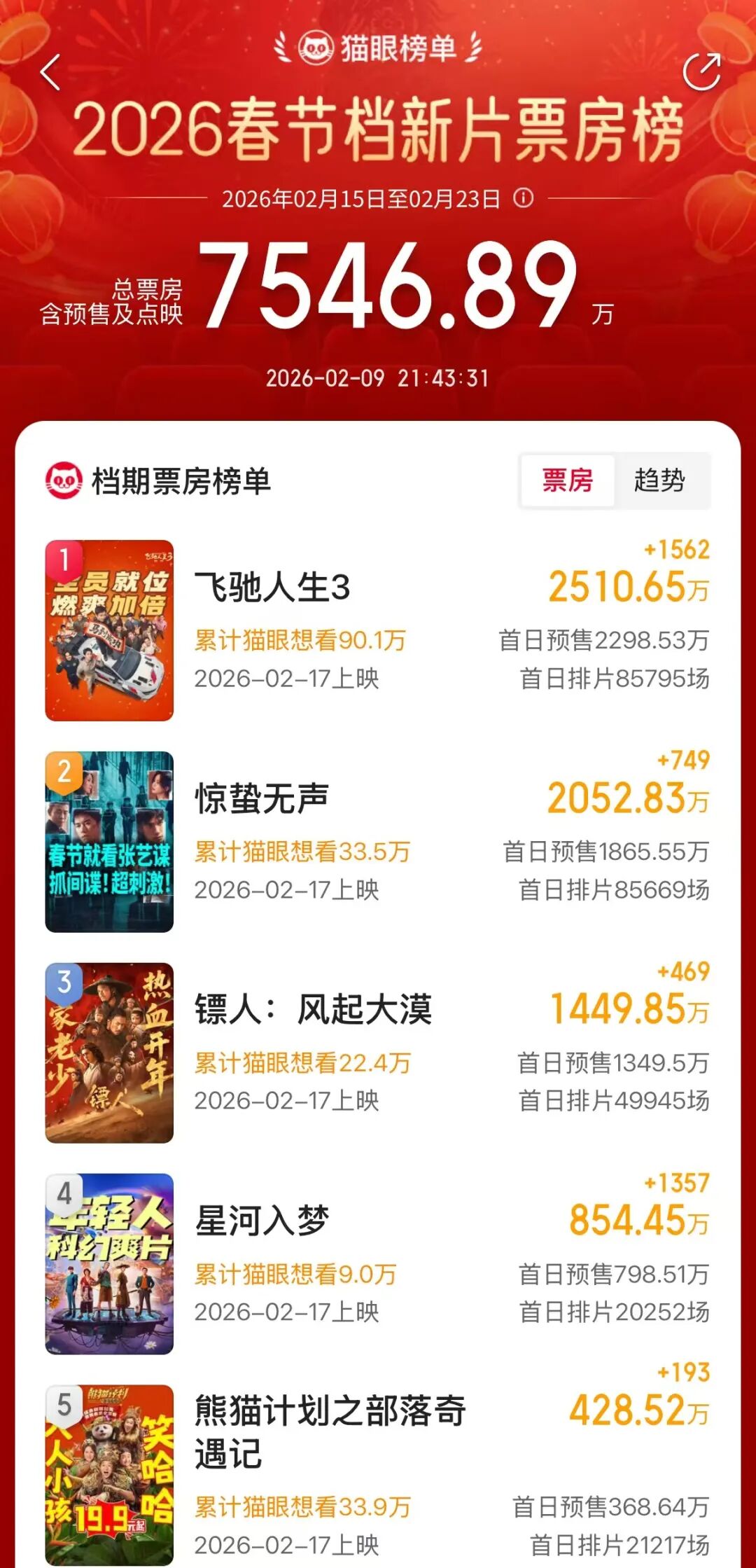 春节档新片预售总票房,突破7500万元!