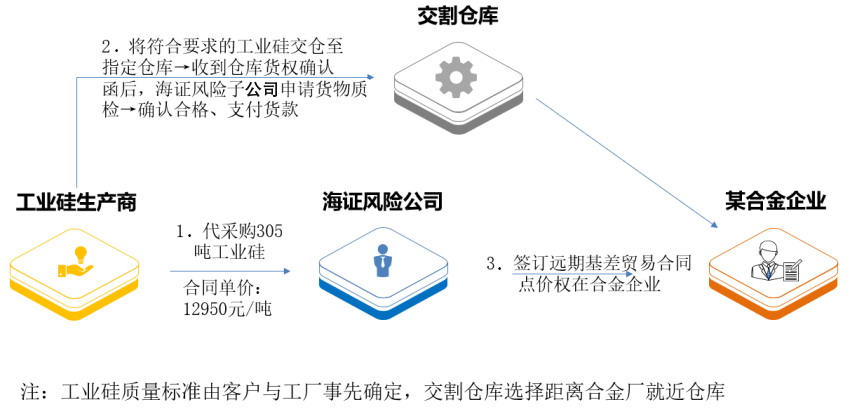 上海海证风险管理有限公司创新业务模式 2024年以来,工业硅价格持续走低,产业链利润收缩,企业资金压力也持续增加。上海海证风险管理有限公司(下称海证 风险子公司)充分了解企业需求,创新应用"代理采购+套期保值"业务模式,有效帮助实体降低采购成本、缓解资金压力, 且大大降低了双方违约的风险。未来,随着期货期权等衍生工具更加广泛地运用在产业上下游贸易环节,将使传统产业链 贸易更加高效、更加稳定,最终实现实体产业和金融的共赢。 2024年以来,工业硅价格持续走低,产业链上下游面临利润收缩的风险,且因回款周期延长,企业资金周转压力也持续增 加。 其间,海证风险子公司积极拜访相关实体企业,充分了解企业需求。拜访中发现,陕西省榆林市的X公司存在原料成本偏 高,利润倒挂的问题。为了帮助企业克服经营中的实际困难,2024年5月,海证风险子公司金属业务部为X公司代理采购了 305吨工业硅,并于当年8月通过点价销售给X公司。 海证风险子公司通过创新应用"代理采购+套期保值"业务模式,有效缓解了X公司的资金压力、维稳其上下游关系,同时降 低了其工业硅原料库存贬值的风险。 案例背景 为了践行期货服务实体经济的使命,海证风险子公司凭借 ...