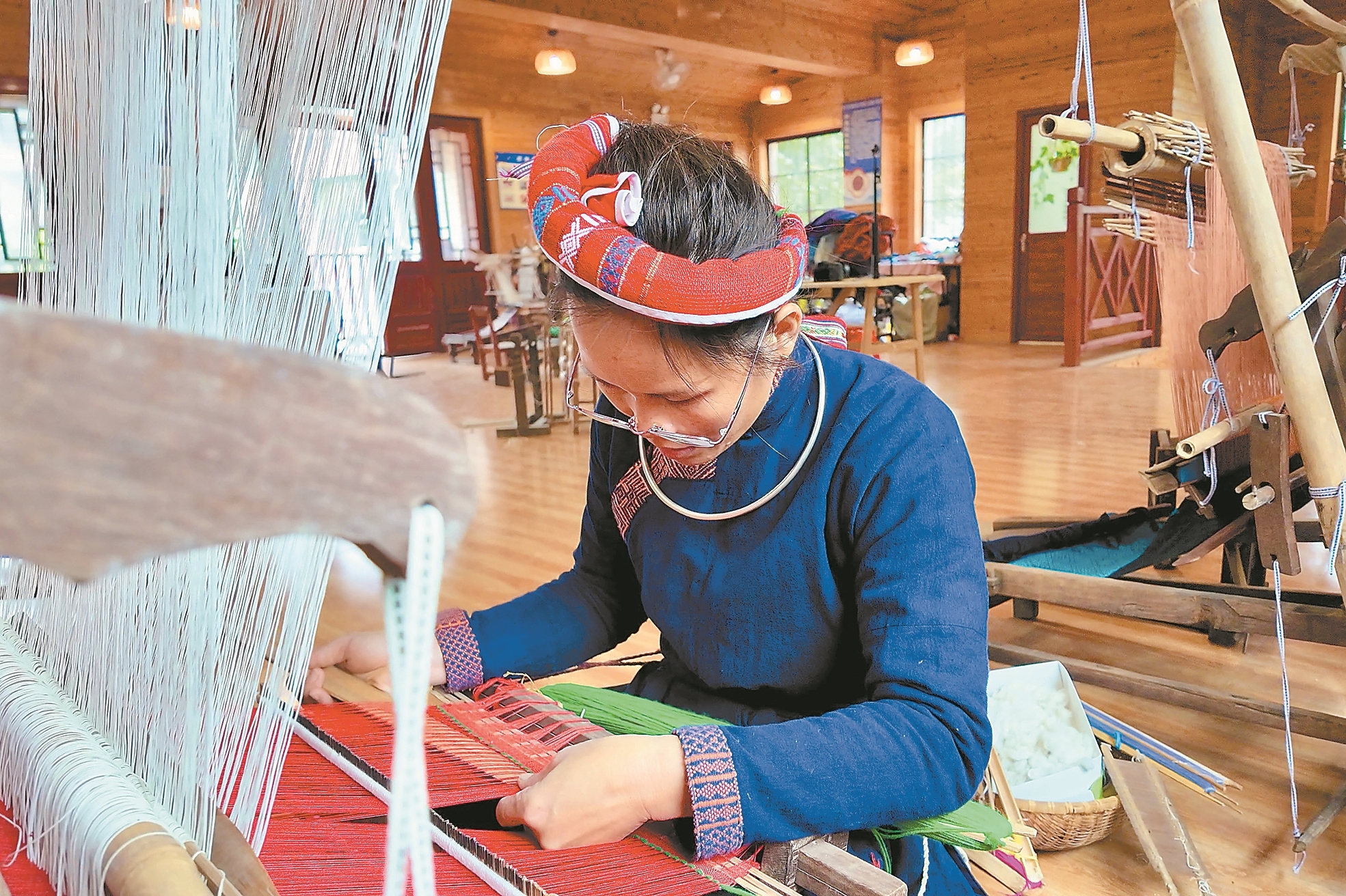 李东梅右手执挑花尺,左手指尖轻数细密的经线,进行织锦中最见真章的工序——挑花结本。 织就一匹壮锦,要历经牵经、整经、穿筘、梳纱、上机、挑花结本、走梭、打纬等15道繁复工序。手、眼、足需默契如舞,数万次重复单调的动作,才 能织出寥寥数厘米,"寸锦寸金"的说法,便由此而来。 这其中,最见真章的当属挑花结本,俗称"编花笼",堪称壮锦的"纹样密码"。 12月8日,初冬的寒意漫过边关,清冽的风掠过龙州县金龙镇双蒙村板池屯——这里是壮锦技艺的重要发源地。推开织锦工坊的木门,斑斓色彩扑面而 来:艳色的围巾、精巧的首饰、摇曳的流苏挂件、古朴的箱包……每一件都浸着匠人指尖的温度,默默诉说着一段绵延千年的故事。 工坊深处,负责人李东梅静坐织机前,正专注赶制一条壮锦围巾。她手腕微动,踏板轻响,"哐当、哐当"的声响里,木梭如舟,载着碧绿的纬线在橘红 的经线间穿行,如意纹、万字纹、几何纹等图案次第浮现,流淌出独有的壮家风情。 "这条用'通经通纬'织法的围巾,已织了十余日,尚不足一米长。"李东梅手下未停,眉眼间漾着专注,"要是用'通经断纬'织法,色彩更丰富,却得耗上 一个月功夫。"她娓娓道来,"通经通纬,经纬各守一色,最宜织素雅纹样;通 ...