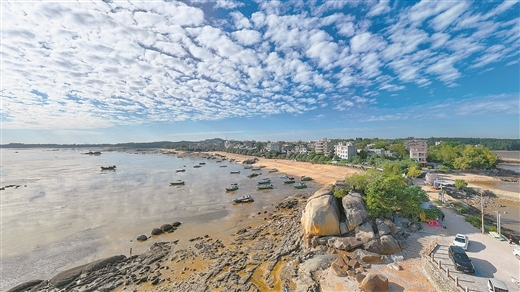 三娘湾以碧海、沙滩、奇石、绿林、渔家风光闻名。陆敏 摄 三娘湾名称的由来就充满传奇色彩。这片海湾以奇石闻名,千百年来,风浪在海滩上雕琢出千姿百 态的礁石,这里还流传着许多动人传说,最著名的当属三娘石。 这是海边的三块天然巨石,修长峭立,并排伫立仿如人形,在民间故事中,巨石为三位仙女所化, 这片海湾也因此被称作三娘湾。据说伏波将军马援平定交趾时,还曾在梦中得到三位仙女的指点。 当地渔民视三娘石为神石,每逢出海等重要日子,都要来此祈福,这也成为独特民俗。早年的三娘 石因历史原因损毁,后人又寻得相似的石头重新安设。三娘石寄托着人们对平安幸福的美好愿望。 除了古老传说,三娘湾亦有深厚历史。东汉时,马援在此训练水军、开凿运河,留下诸多史迹。位 于海湾南端的伏波古庙,1900多年来香火不绝。这里还是古代海防要塞和海上丝绸之路的重要节点,散 布周边的乌雷古炮台、古大观港等遗迹,都是鲜活的历史见证。 在自然研究者的眼中,三娘湾是一座丰饶"宝库"。"北部湾第一峰"乌雷岭孕育了茂密植被,木麻黄 与椤麻树的防护林如绿色丝带守护海岸。曲折的岸线绕出海湾、岬角,大片红树林得以生长。海水水质 洁净、咸淡交织,是生命的温床。 逐浪嬉戏的中 ...
