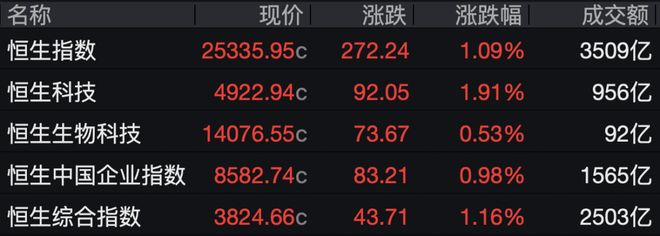 科网股普涨,美团大涨近14%领涨,京东集团、阿里巴巴均涨逾4%。 | 名称 | 涨跌幅 · | 现价 | 涨跌 | 成交额 | | --- | --- | --- | --- | --- | | 美团-W | 13.92% | 90.000c | 11.000 | 219.67亿 | | 京东集团-SW | 4.85% | 112.400c | 5.200 | 20.30亿 | | 阿里巴巴-W | | 4.63% 128.900c | 5.700 | 189.13亿 | | 理想汽车-W | 4.22% | 70.450c | 2.850 | 12.69亿 | | 舜宇光学科技 | 3.40% | 54.700c | 1.800 | 6.91亿 | | 比亚迪电子 | 3.29% | 32.000c | 1.020 | 3.13亿 | | 阿里健康 | 2.73% | 4.900c | 0.130 | 4.70亿 | 个股方面,泡泡玛特跌逾22%,公司今日午间 公布2025年财报,营收371.2亿元,同比增长184.7%,经 调整净利润130.8亿元,同比增长284.5%。LABUBU家族营收首次突破100 ...