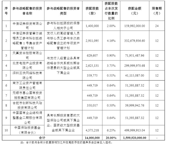 11月25日,摩尔线程发布首次公开发行股票并在科创板上市网下初步配售结果及网上中签结果公告,本 次发行战略配售的缴款及配售工作已结束,本次发行的参与战略配售的投资者均按承诺参与了本次发行 的战略配售。 | के | 参与战略配售的投资 | | | 获配股数 | | | | --- | --- | --- | --- | --- | --- | --- | | | | 参与战略配售的投资者 | 获配股数 | 占本次发 | 获配金额 | 曝售期 | | ਵੇ | 著名称 | 炭型 | (股) | 行数量的 | (元) | (月) | | | | | | 比例 | | | | 1 | 中信证券投资有限公 | 参与科创板课按的保荐 | 1.400.000 | 2.00% | 159,992,000.00 | 24 | | | 间 | 人相关子公司 | | | | | | | 中信证券资管学尔线 | 发行人的高级管理人员 | | | | | | 2 | 程员工参与科创板战 | 与核心员工参与本次战 | 2,911,095 | 4.16% | 332.679.936.60 | 12 | | | 旺盛如果你一脚蛋糕 | 儿 ...