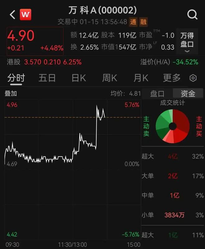 编辑丨瑜见 万科债普遍大涨,"22万科04"、"23万科01"、"22万科02"和"22万科06"均涨超20%,盘中临停。 | 代码 | 名称 | 涨跌幅, | 涨跌 | 现价 | | --- | --- | --- | --- | --- | | 149931 | 22万科04 | 29.71% | 6.9738 | 30.446 | | 148380 | 23万科01 | 26.74% | 6.9400 | 32.890 | | 149478 | 21万科04 | 23.20% | 6.0262 | 32.000 | | 149815 | 22万科02 | 22.41% | 5.2720 | 28.800 | | 149976 | 22万科06 | 20.17% | 4.7000 | 28.000 | 港股万科企业短线拉升,现涨超6%。 1月15日午后,万科A短线拉升,一度涨超5%,截至发稿,涨逾4%,成交额超12亿元。 | < W | 万科企业(2202) | | | | --- | --- | --- | --- | | 交易中 01-15 13:59:21 通 | | | | | 3.580 | 额 ...