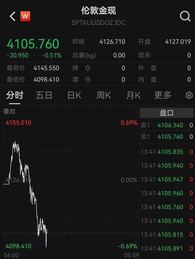 | < W | | 伦敦银现 | | | | Q | | --- | --- | --- | --- | --- | --- | --- | | | | SPTAGUSDOZ.IDC | | | | | | 51.069 | | 昨结 | 51.204 | 开盘 | | 51.192 | | -0.135 | -0.26% | 总量(kq) | 0.00 | 现手 | | 0 | | 最高价 | 51.366 | 持 仓 | 0 | 外 盘 | | 0 | | 最低价 | 50.844 | 增 仓 | 0 | R 醫 | | 0 | | 分时 | 田 日K | | 周K | 月K | 申头 | 0 | | 叠加 | | | | | 盘口 | | | 51.564 | | | | 0.70% 卖1 | 51.102 | 0 | | | | | | 元1 | 51.077 | O | | | | | | 13:41 51.076 | | 0 | | | | | | 13:41 51.081 | | 0 | | | | | | 0.00% 13:41 51.083 | | 0 | | | | | | 13:41 5 ...