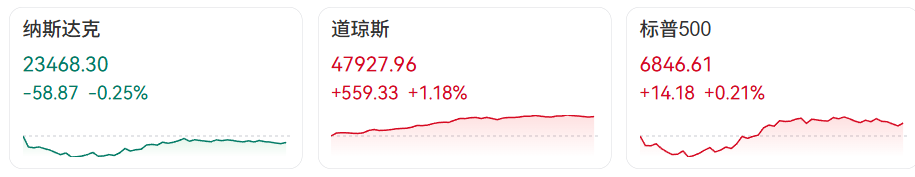编辑 |格蕾丝 美国股市周二涨跌不一 美国股市周二涨跌不一,道琼斯工业指数创下历史收盘新高,投资者关注美国有望结束史上最长的政府停摆,同时科技板块再度 承压,英伟达领跌。 标普500指数11个板块中有10个上涨,医疗保健板块领涨,上涨2.33%,受礼来、强生和艾伯维均涨逾2%带动。 截至收盘,道琼斯工业平均指数上涨559.33点,涨幅1.18%,报47927.96点;标准普尔500指数上涨14.18点,涨幅0.21%,报6846.61 点;纳斯达克综合指数下跌58.87点,跌幅0.25%,收于23468.30点。 美股"七巨头"走势分化,英伟达下跌2.96%,至193.16美元。软银在财报中披露,已于10月出售全部3210万股英伟达股份,交易金 额约58亿美元,市场担忧AI板块估值偏高。 微软上涨0.53%,亚马逊上涨0.28%,苹果上涨2.16%,谷歌母公司Alphabet上涨0.42%;而Meta下跌0.74%,特斯拉下跌1.26%。 热门中概股表现分化,纳斯达克中国金龙指数微跌0.06%。小鹏汽车涨超7%,网易、理想汽车涨逾1%;阿里巴巴跌超3%,哔哩哔 哩和蔚来跌逾1%。 消息面上,美国众议院议员在为 ...
