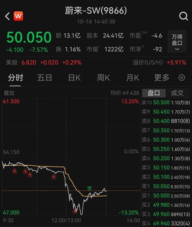 Core Viewpoint - The Hong Kong automotive sector experienced a significant decline, with major companies like NIO and XPeng facing substantial drops in their stock prices [1][3]. Group 1: Stock Performance - NIO's stock fell over 7%, with a peak decline of more than 13% during the trading session [1]. - XPeng Motors saw a decline of over 4% in its stock price [3]. - Other companies such as Li Auto, Great Wall Motors, and Leap Motor also experienced declines, contributing to the overall downturn in the automotive sector [3]. Group 2: Specific Stock Data - NIO-SW (Code: 9866) current price: 50.050, down 7.57% [4]. - XPeng Motors-W (Code: 9868) current price: 82.350, down 4.02% [4]. - Li Auto-W (Code: 2015) current price: 87.850, down 2.01% [4]. - Great Wall Motors (Code: 2333) current price: 15.150, down 3.69% [4]. - Leap Motor (Code: 9863) current price: 57.700, down 3.67% [4].