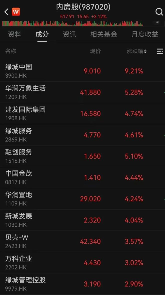 | 万科企业 | 4.430 | 3.02% | | --- | --- | --- | | 2202.HK | | | | 绿城管理控股 | | | | 9979.HK | 3.190 | 2.90% | 11月10日午后,港股内房股走高,截至发稿,绿城中国涨超9%,富力地产涨超7%,华润万象生活、融 创服务涨超5%,华润置地、新城发展等个股跟涨。 | < w | 内房股(987020) | | | | | --- | --- | --- | --- | --- | | | 517.91 15.65 +3.12% | | | | | | THE THE THE REAL PAR A | | | | | 経版 成分 | 资讯 | | 相关基金 月度收益 | | | 名称 | | 现价 | 涨跌幅 ◆ | II | | 绿城中国 | | 9.010 | 9.21% | | | 3900.HK | | | | | | 华润万象生活 | | 41.880 | 5.28% | | | 1209.HK | | | | | | 建发国际集团 | | 16.580 | 4.74% | | | 1908.HK | | | | ...