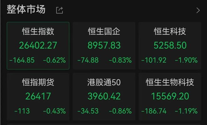 港股科网股普跌,阿里巴巴、小米集团、美团跌超3%。宁德时代涨超2.8%。 港股AI应用股走强。海致科技集团涨23.65%、阜博集团涨4.11%、MINIMAX-WP涨6.47%。 港股有色金属板块走强。灵宝黄金涨逾7%,洛阳钼业涨逾5%,山东黄金、紫金矿业等涨逾3%。 微信编辑| 苏小 2月16日,港股开盘,恒指低开0.25%,此后,跌幅扩大至近1%。恒生科技指数跌0.19%,此后跌幅扩大 至近2%。 | 整体市场 [△ | | | | --- | --- | --- | | 恒生指数 | 恒生国花 | 恒生科技 | | 26402.27 | 8957.83 | 5258.50 | | -164.85 -0.62% | -74.88 -0.83% | -101.92 -1.90% | | 恒指期货 | 港股通50 | 恒生生物科技 | | 26417 | 3960.42 | 15569.20 | | -113 -0.43% | -34.53 -0.86% | -186.74 -1.19% | | 名称 | 现价 | 涨跌幅 | | --- | --- | --- | | 阿里巴巴-W | 150.700 | ...