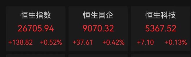 | 恒生指数 | 恒生国企 | 恒生科技 | | --- | --- | --- | | 26705.94 | 9070.32 | 5367.52 | | +138.82 +0.52% | +37.61 +0.42% | +7.10 +0.13% | 春节前最后一个交易日,港股开市半日。恒指报26723.0点,涨0.59%,恒生科技指数报5367.28点,涨 0.13%。AI应用概念大涨,MINMAX-WP涨24%;智谱涨4%;有色金属板块大涨,洛阳钼业涨逾6%。 紫金矿业、灵宝黄金涨逾4%。半导体板块走强,澜起科技涨逾14%,兆易创新涨逾9%。 | 名称 | 现价 | 涨跌幅 | | --- | --- | --- | | 阿里巴巴-W | 154.700 | -0.45% | | 9988.HK | | | | MINIMAX-WP | 847.000 | 24.56% | | 0100.HK | | | | 腾讯控股 | 533.000 | 0.19% | | 0700.HK | | | | 兆易创新 | 406.200 | 9.78% | | 3986.HK | | | | 紫金矿业 | 43.520 ...