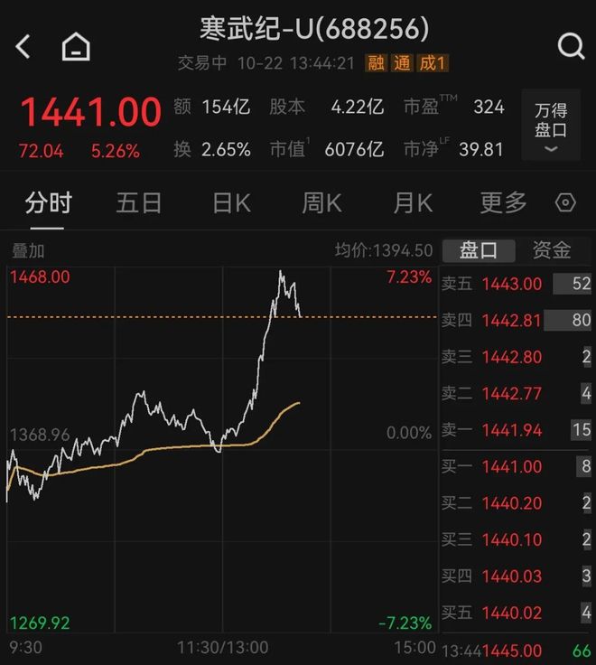 编辑|钉钉 10月22日午后, 沪指拉升翻红,半导体产业链复苏,寒武纪短线发力,一度涨超7%;截至发稿,该股 涨幅为5.26%,报1441元/股,成交额达154亿元。 ...