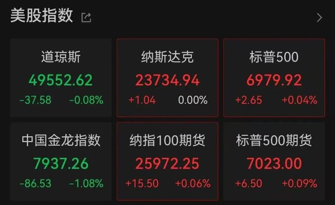 Group 1 - The U.S. stock market showed slight fluctuations at the opening, with the Dow Jones down 0.08% and the S&P 500 up 0.04% [1] - The Nasdaq China Golden Dragon Index fell over 1%, with Chinese concept stocks generally declining; Kingsoft Cloud and Pinduoduo dropped over 4%, Baidu Group fell more than 3%, while Alibaba, JD.com, Zhihu, and Xpeng Motors also experienced declines [3] - Chip stocks mostly rose, with Intel increasing over 4%, AMD up more than 3%, and TSMC slightly rising [3] Group 2 - Gold stocks generally performed well, with Jintian rising over 2% and AngloGold up more than 1% [3]