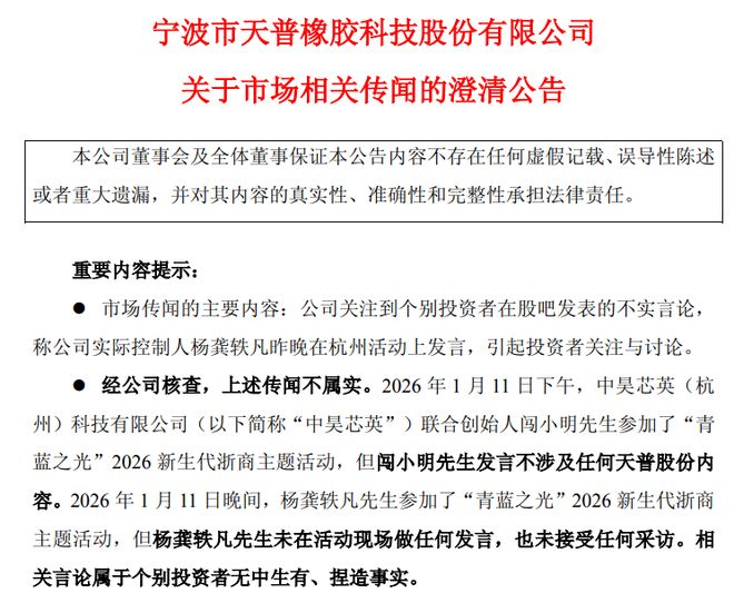1月12日午间,天普股份发布澄清公告称,公司关注到个别投资者在股吧发表的不实言论,公司实际控 制人杨龚轶凡昨晚在杭州活动上发言,引起投资者关注与讨论。经公司核查,上述传闻不属实。 此前在1月5日,上交所发布关于对宁波市天普橡胶科技股份有限公司及有关责任人予以监管警示的决 定。上交所表示,"人工智能"属于市场热点概念,为投资者高度关注。公司前期筹划控制权转让事项, 涉及人工智能业务相关市场主体,股价已经多次触及异常波动,并多次发布风险提示公告称主营业务未 发生重大变化。在此背景下,本次公司设立经营范围涵盖人工智能相关业务的全资子公司,可能再次引 发市场对公司开展相关业务的猜想。公司在市场已有相关传闻、股价出现异常波动后又在短时间内变更 子公司经营范围,在明知自身无开展人工智能相关业务计划的情况下,均未在设立子公司后股价出现异 常波动的相关公告中进行针对性说明澄清,未充分提示相关风险,信息披露不准确、不完整,风险提示 不充分,可能对投资者决策造成误导。公司上述行为违反了《上海证券交易所股票上市规则》第1.4 条、第2.1.1条、第2.1.5条、第2.1.6 条,《上海证券交易所上市公司自律监管指引第1号——规范运 ...