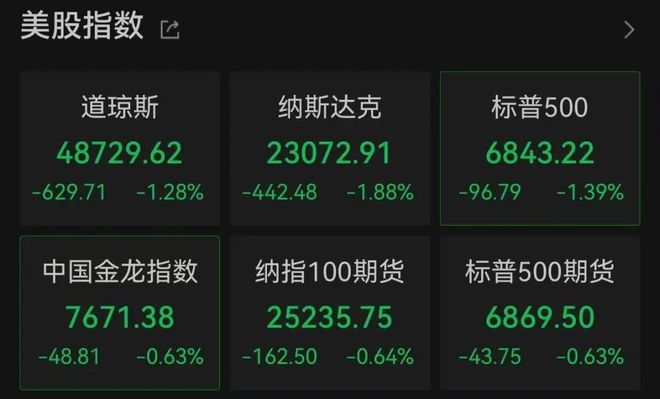 2026.01.21 本文字数:1892,阅读时长大约3分钟 作者 |第一财经 胡弋杰 在美国总统特朗普再度向欧洲释放关税威胁后,全球市场风险偏好明显降温。周二,华尔街三大股指与 全球主要股市一道遭遇抛售,避险资金涌入黄金,美国国债在多重冲击下波动加剧。 截至收盘,道琼斯工业指数下跌870.74点,跌幅1.76%,报48488.59点;标普500指数下挫143.15点,跌 幅2.06%,报6796.86点;纳斯达克综合指数下跌561.07点,跌幅2.39%,报22954.32点。三大股指均录得 自去年10月10日以来的最差单日表现,标普500指数与纳斯达克综合指数双双跌破50日移动均线。 大型科技股全线下跌,英伟达跌4.32%,苹果跌3.45%,微软跌1.16%,谷歌跌2.42%,亚马逊跌3.40%, Meta跌2.60%,特斯拉跌4.17%,博通跌5.43%,甲骨文跌5.85%,奈飞跌0.84%,英特尔涨3.41%。 热门中概股普跌,纳斯达克中国金龙指数跌1.45%,阿里巴巴跌1.82%,京东跌1.80%,拼多多跌 2.15%,蔚来汽车跌3.18%,小鹏汽车跌3.15%,理想汽车跌2.84%,哔哩哔哩跌6. ...