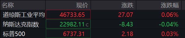| 名称 | 现价 | 涨跌 | 涨跌幅 | | --- | --- | --- | --- | | 道琼斯工业平均 | 46733.65 | 27.07 | 0.06% | | 纳斯达克指数 | 22982.11 c | -8.43 | -0.04% | | 标普500 | 6737.31 | 2.18 | 0.03% | 编辑丨瑜见 10月21日,美股三大指数开盘涨跌不一,道指涨0.06%,纳指跌0.04%,标普500指数涨0.03%。黄金股 大跌,哈莫尼黄金跌逾9%,盎格鲁黄金跌近8%,金罗斯黄金跌逾7%。"人造肉第一股"Beyond Meat大 涨45%。 ...
