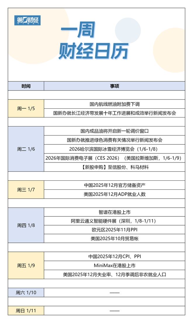 周日 1/11 | 第1次5 | | | --- | --- | | | 45 F | | 时间 | 事项 | | 周一 1/5 | 国内航线燃油附加费下调 | | | 国新办就长江经济带发展十年工作进展和成效举行新闻发布会 | | 周二 1/6 | 国内成品油将开启新一轮调价窗口 | | | 国新办就推进绿色消费有关情况举行新闻发布会 | | | 2026哈尔滨国际冰雪经济博览会 (1/6-1/8) | | | 2026年国际消费电子展(CES 2026) (美国拉斯维加斯, 1/6-1/9) | | | 【新股申购】至信股份、科马材料 | | 周三 1/7 | 中国2025年12月官方储备资产 | | | 美国2025年12月ADP就业人数 | | 周四 1/8 | 阿里云通义智能硬件展(深圳, 1/8-1/11) | | | 智谱在港股上市 | | | 欧元区2025年11月PPI | | | 美国2025年10月贸易帐 | | 周五 1/9 | 中国2025年12月CPI、PPI | | | MiniMax在港股上市 | | | 美国2025年12月失业率、12月季调后非农就业人口 | | 周六 1/ ...