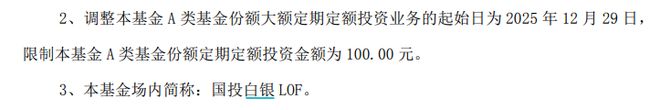 12月25日晚,全市场唯一一只主要投资于白银期货的基金产品"国投白银LOF(161226)"公告称,12月29 日起,限制本基金A类基金份额定期定额投资金额为100.00元。 另外,其今晚稍早时候再度发布公告称,截至2025年12月25日,本基金二级市场的收盘价为2.804元, 明显高于基金份额净值,投资者如果盲目投资于高溢价率的基金份额,可能面临较大损失。为保护投资 者利益,本基金将于2025年12月26日开市起至当日10:30停牌,自2025年12月26日10:30复牌。 此前,该基金A类基金份额申购金额上限为500.00元。 编辑丨瑜见 ...
