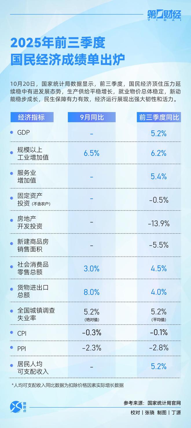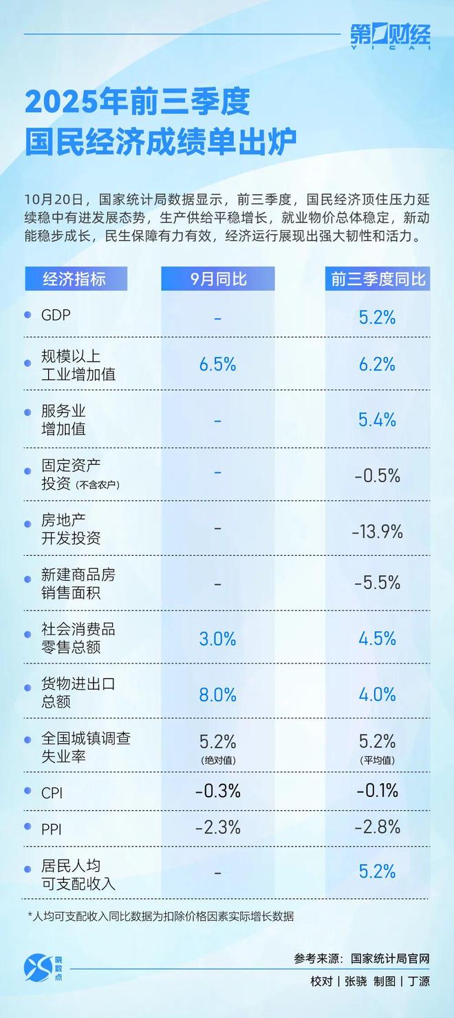 10月20日,国家统计局数据显示,前三季度,国民经济顶住压力延 续稳中有进发展态势,生产供给平稳增长,就业物价总体稳定,新动 能稳步成长,民生保障有力有效,经济运行展现出强大韧性和活力。 | 经济指标 | 9月同比 | 別二季度同比 | | --- | --- | --- | | · GDP | | 5.2% | | 规模以上 工业增加值 | 6.5% | 6.2% | | 服务业 | | | | 增加值 | | 5.4% | | 固定资产 | | -0.5% | | 投资(不含农户) | | | | 房地产 | | -13.9% | | 开发投资 | | | | 新建商品房 | | -5.5% | | 销售面积 | | | | 社会消费品 | 3.0% | 4.5% | | 零售总额 | | | | 货物进出口 | 8.0% | 4.0% | | 总额 | | | 2025年前三季度 国民经济成绩单出炉 | 全国城镇调查 | 5.2% | 5.2% | | --- | --- | --- | | 失业率 | (绝对值) | (平均值) | | · CPI | -0.3% | -0.1% | | · PPI ...
