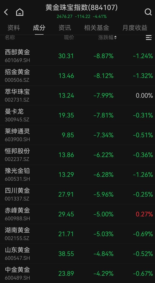 港股方面,黄金股也集体走弱,紫金黄金国际、大唐黄金、 珠峰黄金、龙资源均跌超5%。 | < W | [HK]黄金珠宝指数(887654) | | | | | --- | --- | --- | --- | --- | | | 5658.99 -192.48 -3.29% | | | | | *** | 成分 资讯 相关基金 | | 月度收益 | | | 名称 | | 现价 | 涨跌幅 ◆ | li | | 紫金黄金国际 | | 139.900 | -5.35% | | | 2259.HK | | | | | | 大唐黄金 | | 0.540 | -5.26% | | | 8299.HK | | | | | | 珠峰黄金 | | 1.990 | -5.24% | | | 1815.HK | | | | | | 龙资源 | | 7.940 | -5.02% | | | 1712.HK | | | | | | 潼关黄金 | | 2.840 | -4.38% | | | 0340.HK | | | | | | 老铺黄金 | | 810.500 | -2.17% | | | 6181.HK | | | | | | 周六 ...
