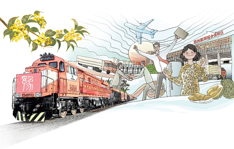 一颗榴莲,成为新一轮豫桂合作的"红娘" 郑州市民赵芳是一位榴莲爱好者,她每周都要到家附近的大型商超买颗榴莲"过过瘾"。冻着吃、烤着吃、榴 莲壳炖鸡汤……赵芳热衷发掘榴莲各种新鲜食用方法,乐此不疲。 自称"榴莲专家"的赵芳却想不到,她无比熟悉的榴莲竟能跳出食物的范畴,扮演"红娘"的角色。 时间回溯到2024年8月25日,吉隆坡—郑州鲜食榴莲包机首航落地河南,马来西亚鲜食榴莲第一次进入我国境 内,1500箱、净重15吨、10个品种的鲜食榴莲从郑州航空港经济综合实验区走向全国消费者的餐桌。 正是这次马来西亚鲜食榴莲的"进口之旅",拉开了新一轮豫桂合作的大幕。 插图/王伟宾 中越边境,友谊关前,广西凭祥综合保税区里,建筑面积近1.8万平方米的仓库资源正向河南企业敞开怀抱, 广阔的东盟市场近在咫尺。 中原腹地,郑州机场北侧,郑州新郑综保区保税物流园已是广西企业的"飞地",既能直接对接覆盖数亿消费 者的中部地区庞大市场,又可借助郑州—卢森堡"空中丝绸之路"等航线资源直达全球主要经济体。 近年来,河南积极主动融入服务全国统一大市场,与广西频频互动,"中原象"与"八桂香"心手相连,谋划共 建"内陆+沿海"双枢纽,打通"郑州航 ...