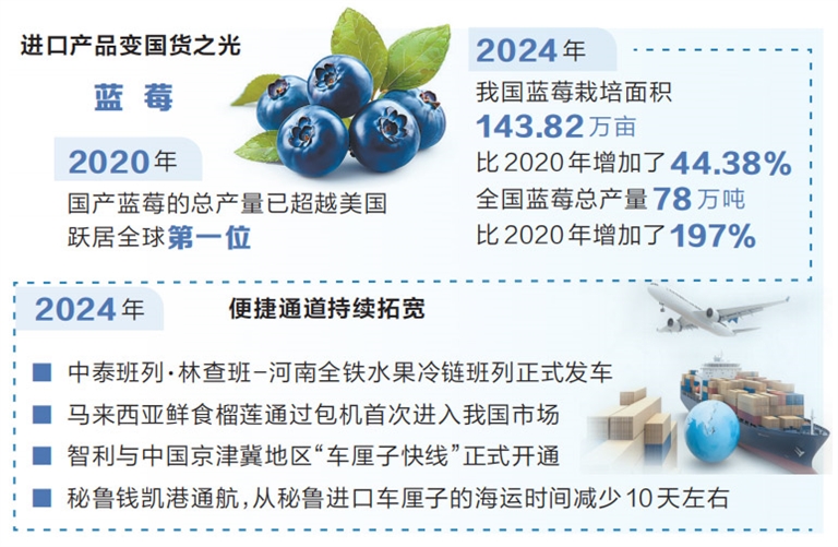 对于"吃货"们来说,今年是个"甜蜜"的年份。自年初起,草莓、车厘子、蓝莓等以往的高价水果,价格纷 纷"跳水",让网友们直呼:实现了水果自由。 那么,这些水果降价是偶然还是趋势?背后有何原因? 国产蓝莓已成市场主流 以蓝莓为例,多地消费者都发现,今年的蓝莓不仅比以往便宜,而且更甜、更好吃了。记者走访郑州市多家 水果零售店发现,一盒125克的蓝莓售价多为9.9元至十几元,最便宜的两盒仅售10元。一家店内,正在选购 水果的杨女士说,今年的蓝莓确实便宜,口感也更好,吃起来脆甜。 河南万邦国际农产品物流城商户张要刚告诉记者,蓝莓是他的主营产品之一,前年在市场上售卖的还多是从 秘鲁、智利等国进口的蓝莓,售卖周期为11月到来年2月。但近两年,国产蓝莓已成市场主流,并且从11月到 来年5月都有供应。 "以前进口的蓝莓,一件(1500克)价格一般在二三百元,现在最好品质的国产蓝莓,价格最高时一件也只有 二百多元。而且从往年市场行情来看,等到5月、6月大量上市后,蓝莓价格还要降。"张要刚说。 国产水果种类丰富,量大又高质 张要刚告诉记者,近年来国内产区蓝莓种植面积持续增加,种植技术也逐渐优化,产品品质与产量同时提 高,消费者买到 ...