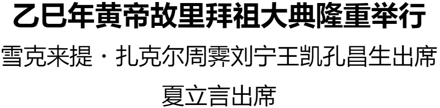 3月31日,农历三月初三,乙巳年黄帝故里拜祖大典在郑州新郑市黄帝故里隆重举行。海内外中华儿女共拜人文始祖轩辕 黄帝,共同祈福祖国繁荣昌盛、世界和平安宁。 全国人大常委会副委员长雪克来提・扎克尔,中央港澳办分管日常工作的副主任周霁,省委书记刘宁、省长王凯、省政协 主席孔昌生出席大典。 中国国民党副主席夏立言出席大典。 9时50分许,大典主司仪孔昌生宣布拜祖大典开始。 大典共有9项仪程:盛世礼炮、敬献花篮、净手上香、共拜始祖、恭读拜文、高唱颂歌、乐舞敬拜、祈福中华、天地人 和。 现场全体肃立,21响礼炮轰鸣,响彻云霄。随后,雪克来提・扎克尔、刘宁、王凯、张志军、高峰、郑平、阎京华、安伟 等先后走上拜祖台,向黄帝像敬献花篮。 在净手上香仪程中,夏立言、霍震寰、崔世昌、林铭聪、林少华、祁岳、洪来喜、蔡国伟、石聚彬等嘉宾虔诚上香。 共拜始祖。在主司仪带领下,全体人员面向黄帝像,深深三鞠躬,表达对人文始祖的无限追思和尊崇。 共拜始祖仪程后,刘宁登上拜祖台,恭读拜祖文:"赫赫始祖,轩辕黄帝,文明启祥,万古流芳……"祈佑伟大祖国繁荣昌 盛、各族人民幸福安康。 高唱颂歌。香港、澳门、台湾及海外华人歌手,与少年儿童共同唱响《黄帝 ...