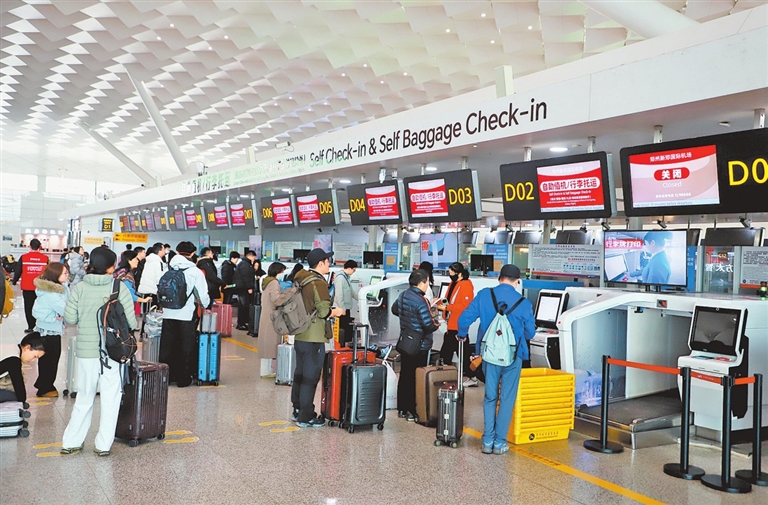 2月20日,郑州机场单日旅客吞吐量首次超过10万人次,创下1997年通航以来最高水平,实现里程碑式突破, 河南民航运输保障能力迈上新台阶。 今年春运启动以来,郑州机场航班量、客流量持续快速攀升。截至2月20日,郑州机场累计保障进出港客运航 班1.18万架次,较2025年春运同期增长3.3%;服务进出港旅客177.4万人次,较2025年春运同期增长5.2%,增 速位居中部六省大型机场第一,彰显了强劲发展动能。 回顾春运前半程,郑州机场运行态势持续向好。春运前两周,日均保障进出港航班700架次,单日航班量最多 达727架次,日均服务旅客9.36万人次,单日客流最多达9.85万人次,为突破10万人次大关奠定了坚实基础。 春节假期期间,郑州机场候机大厅里人流如织。 郑州机场供图 为满足春运期间广大旅客集中出行需求,中豫航空集团提前部署,分析研判高峰时段航线航班特点,不断提 升枢纽运行效率与服务品质。郑州机场组织客运航线运力资源调配,与航空公司、驻场单位等共同加强航班 保障全环节精细化管控,协调航空公司在郑增加运力投放,春运期间共计增加航班约2000架次,日均增加航 班50架次,新开和恢复郑州至曼谷、新加坡、河内等5条 ...