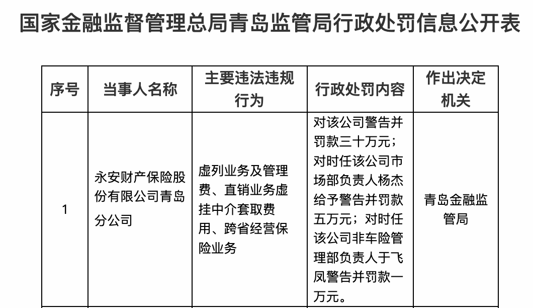 | 序号 | 当事人名称 | 主要违法违规 | 行政处罚内容 | 作出决定 | | --- | --- | --- | --- | --- | | | | 行为 | 对该公司警告并 | 机关 | | | 永安财产保险股 份有限公司青岛 | 费、直销业务虚 挂中介套取费 | 罚款三十万元; 对时任该公司市 | 管局 | | | | 虚列业务及管理 | | | | | | | 场部负责人杨杰 | | | 1 | | | 给予警告并罚款 | 青岛金融监 | | | 分公司 | | 五万元;对时任 | | | | | 用、跨省经营保 | | | | | | 险业务 | 该公司非车险管 | | | | | | 理部负责人于飞 | | | | | | 凤警告并罚款一 | | | | | | 万元。 | | 截图:国家金融监督管理总局官网 凤凰网财经讯 12月11日,据国家金融监督管理总局官网消息,永安财险青岛分公司因虚列业务及管理费、直销业务虚挂中介套取费用、跨省经营保险 业务3项违规,受到警告并被罚款30万元。时任该公司市场部负责人杨杰、时任该公司非车险管理部负责人于飞凤受到警告,并分别被罚款5万元和1万 元。 ...