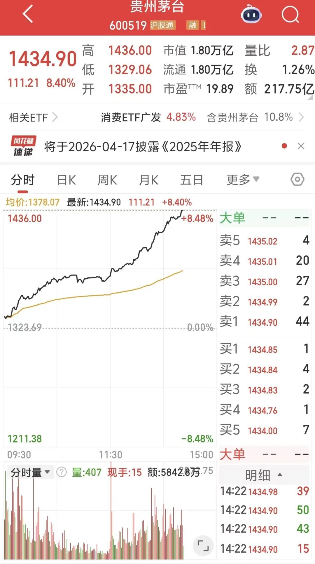 凤凰网财经讯 1月29日,贵州茅台涨幅扩大至8.40%,现报1434.90元,成交额达217.75亿元。 机构观点 西部证券曹柳龙指出:当前公募基金持仓白酒已经低于第二轮(2009年)和第四轮(2019年)白酒周期启动时的仓位,筹码进一步出清,新一轮周期启动 的筹码条件已基本满足。 华夏基金数量投资部分析称,自2021年初以来,食品饮料板块已经连续调整近五年,行业悲观预期或已充分释放。复盘历史数据,连跌3~4年的板块往往 有反转。像2025年涨幅领先的有色金属、化工、电力设备、医药生物等,此前都曾经连续调整超3年。 消息面上,飞天茅台价格出现了一轮持续上涨,据业内人士透露,目前茅台市场需求并未出现激增的情况,但临近年末部分烟酒店提前备货和茅台采取的 控量策略,或是推动价格上涨的主要原因。 第三方报价平台显示,1月29日,2026年原箱茅台价格单瓶价格上涨20元为1610元/瓶,回升到1600元以上,散瓶的价格保持在1570元/瓶,前几日茅台的 批价还稳定在1550元/瓶左右。 记者在"i茅台"平台看到,1499元的普茅连续第29天在多次秒空后显示售罄。在北京多个即时零售平台显示,普茅的零售价也回升到1570元 ...