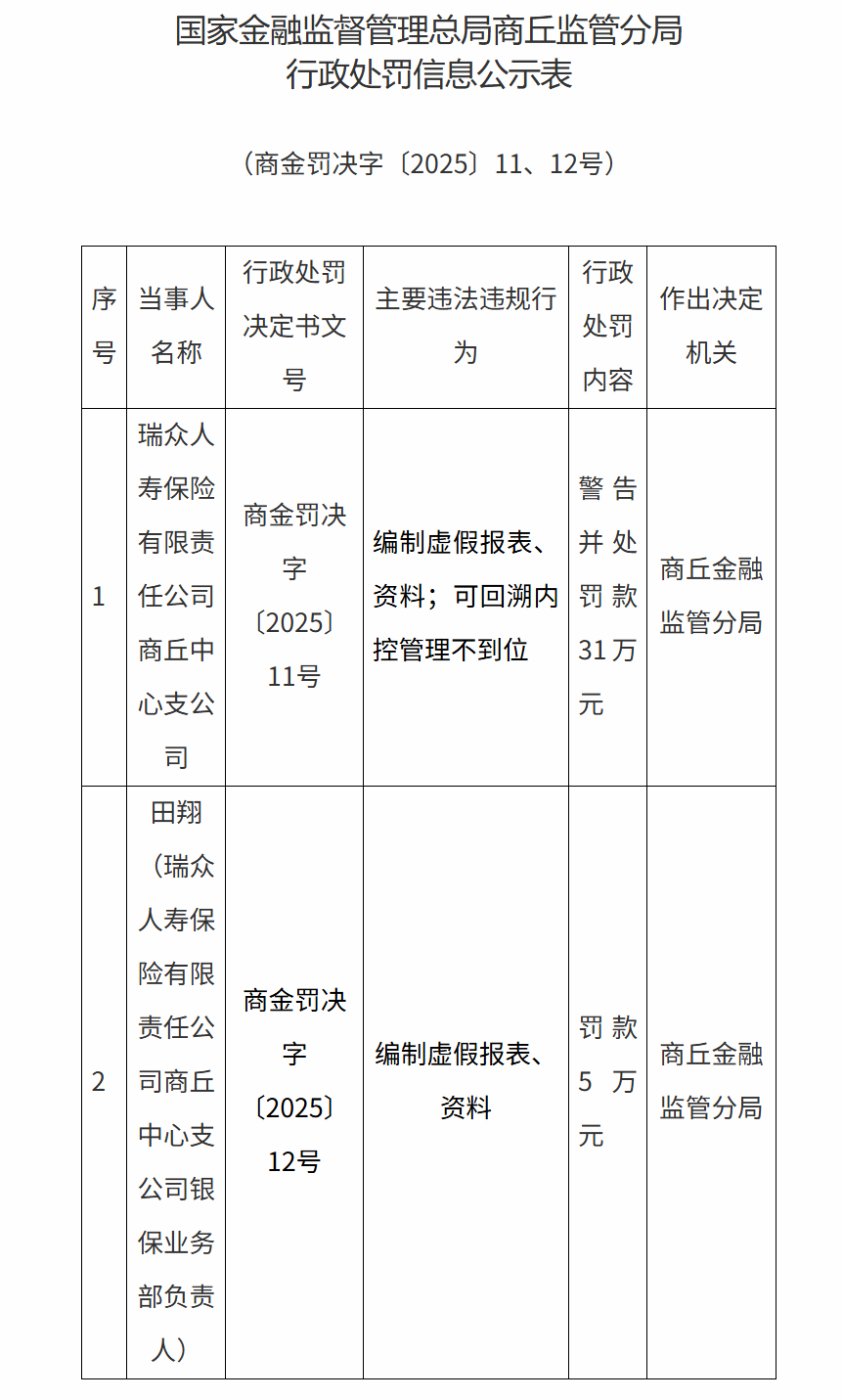 凤凰网财经讯 1月19日,据国家金融监督管理总局官网消息,瑞众人寿商丘中心支公司因编制虚假报表、资料,可回溯内 控管理不到位等违规受到警告并被罚款31万元。 时任瑞众人寿商丘中心支公司银保业务部负责人田翔,因编制虚假报表、资料被罚款5万元。 | 序 | 当事人 | 行政处罚 | 主要违法违规行 | 行政 | 作出决定 | | --- | --- | --- | --- | --- | --- | | 를 | 名称 | 决定书文 | 为 | 处罚 | 机关 | | | 瑞众人 | 를 | | 内容 | | | 1 | 寿保险 任公司 | 商金罚决 字 | 资料;可回溯内 | 警 告 罚 款 | 國英國國 | | | 有限责 | | 编制虚假报表、 | 并处 | | | | | (2025) | | | 监管分局 | | | 商丘中 | 11号 | 控管理不到位 | 31 万 | | | | 心支公 | | | 元 | | | | 间 | | | | | | | 田翔 (瑞众 | | | | | | | 人寿保 | | | | | | | 险有限 | 商金罚决 | | | | | | 责任公 | | | 罚 款 ...