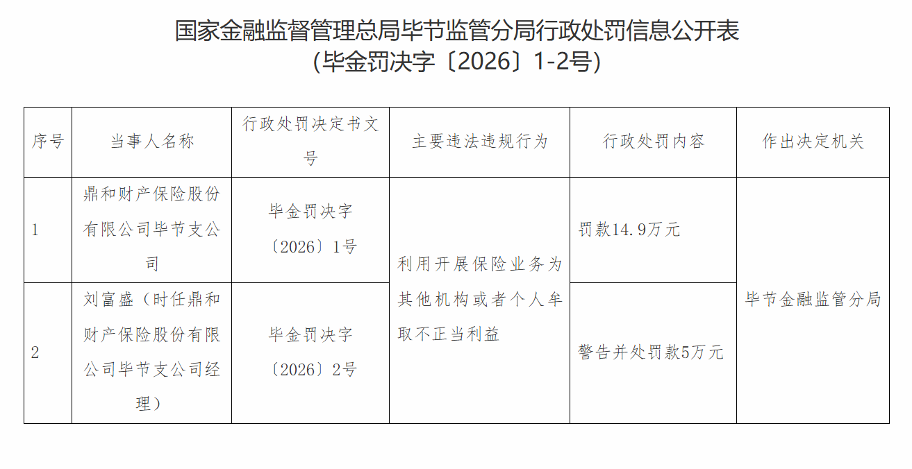 | 序号 | 当事人名称 | 行政处罚决定书文 | 主要违法违规行为 | 行政处罚内容 | | --- | --- | --- | --- | --- | | | | 를 | | | | | 鼎和财产保险股份 有限公司毕节支公 | 毕金罚决字 (2026) 1号 | | 罚款14.9万元 | | | 트 | | 利用开展保险业务为 | | | 2 | 刘富盛(时任鼎和 | | 其他机构或者个人年 | म्ब 警告并处罚款5万元 | | | 财产保险股份有限 | 毕金罚决字 | 取不正当利益 | | | | 公司毕节支公司经 | (2026) 2号 | | | | | 理) | | | | 凤凰网财经讯 1月19日,据国家金融监督管理总局官网消息,鼎和财险毕节支公司因利用保险业务为其他机构或者个人牟取不正当利益被罚款14.9万元,时 任鼎和财险毕节支公司经理刘富盛受到警告并被罚款5万元。 ...