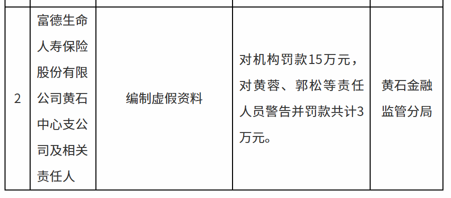 | | 富德生命 人寿保险 | | 对机构罚款15万元, | | | --- | --- | --- | --- | --- | | | 股份有限 | | 对黄蓉、郭松等责任 | 黄石金融 | | 2 | 公司黄石 | 编制虚假资料 | | | | | 中心支公 | | 人员警告并罚款共计3 万元。 | 监管分局 | | | 司及相关 | | | | | | 责任人 | | | | 截图:国家金融监督管理总局官网 凤凰网财经讯 10月24日,据国家金融监督管理总局官网消息显示,富德生命人寿黄石中心支公司因编制虚假资料,被罚款15万 元。 相关责任人黄蓉、郭松等人对上述违规行为负有责任,受到警告,并被罚款共计3万元。 ...